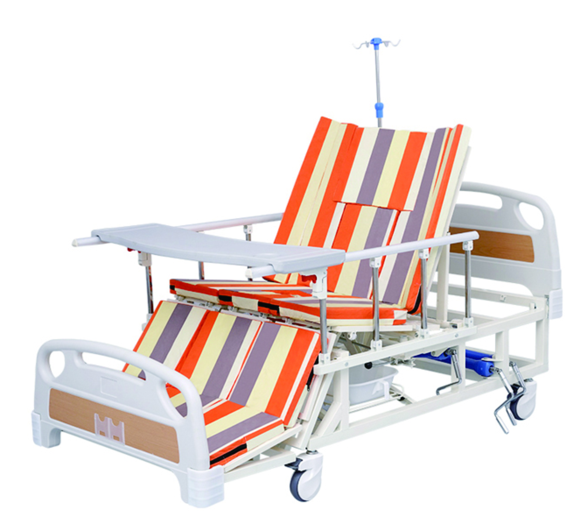2. 配 置:ABS床頭、4柱護欄、ABS餐桌板、靜音腳輪、輸液架、6cm床墊、便盆、洗頭盆